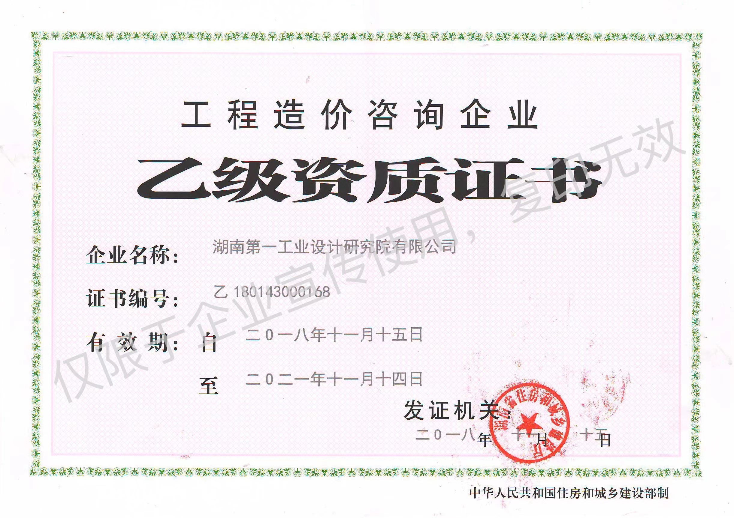 工程造價咨詢企業乙級資質證書